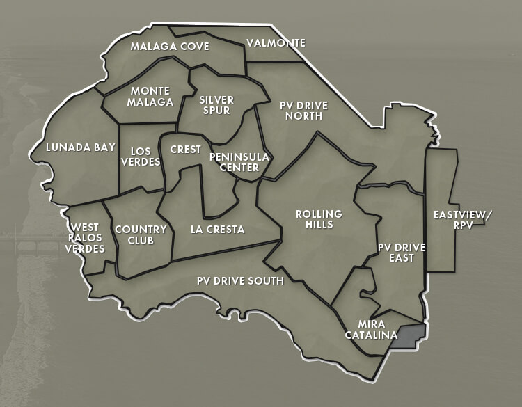 The sprawling peninsula is made up of four distinctive cities Palos Verdes Estate, Rolling Hills, Rancho Palos Verdes, and Rolling Hills Estates. Each city has different sections or communities, all with different attributes, geography, conveniences, and amenities as well as home styles, sizes, and prices ranges. Palos Verdes Estates includes Lunada Bay/Margate, Monte Malaga, Malaga Cove, Valmonte and Palos Verdes Drive North. Rolling Hills is inclusive of itself. Rancho Palos Verdes includes Palos Verdes Drive East, Mira Catalina, Palos Verdes Drive South, West Palos Verdes, Country Club, Los Verdes, and Eastview. And lastly, Rolling Hills Estates which includes La Cresta, Crest, Peninsula Center, and Silver Spur.